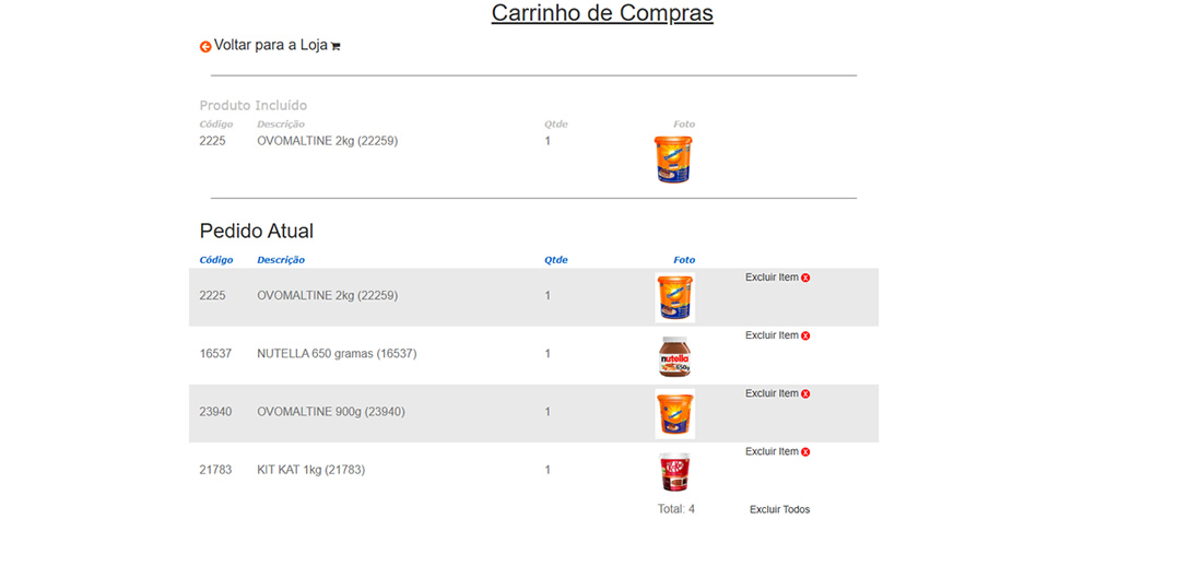 Os produtos selecionados são agrupados em uma relação com os itens (Carrinho de Compras).